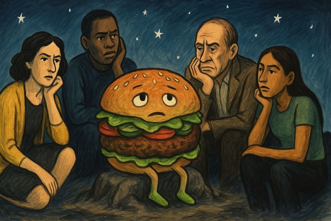 As the night wore on, Max’s thoughts took a more troubling turn. What if the real existential crisis wasn’t about the patty at all, but about the world’s obsession with food choices as identity? People weren’t just eating burgers anymore—they were wearing them as badges of honor, projecting their moral and social standings with every bite. Was it possible that we had gone too far? What would it take for people to see beyond the surface of their food choices? Would we ever reach a point where the burger, whether plant-based or beef, was just… food again?